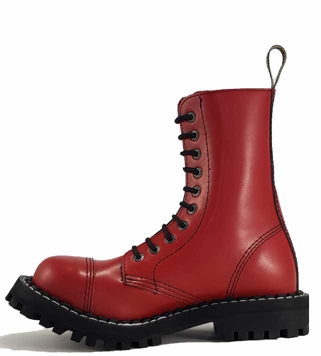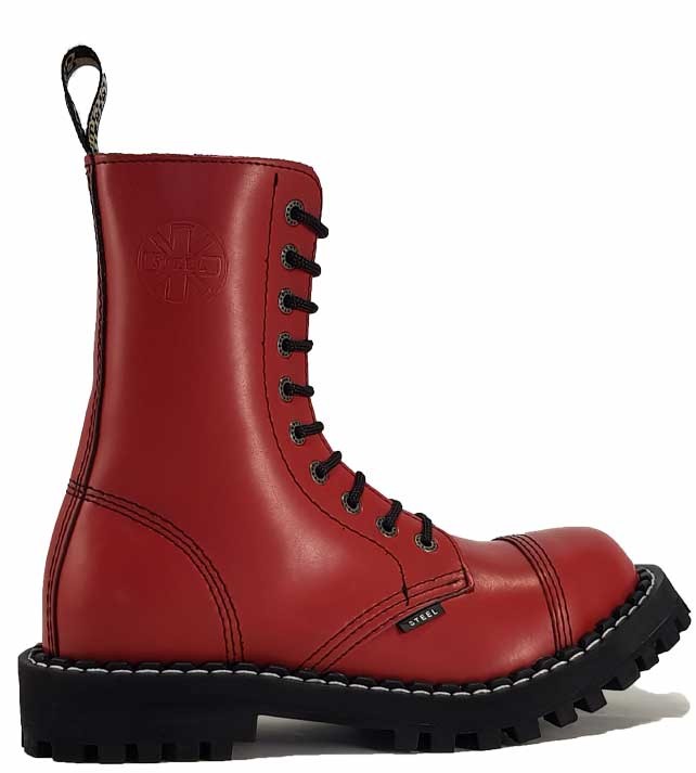 10 Dierkové Topánky Steel Červené, kožený kožený zvršok, podrážka z tvrdenej gumy, trojité šitie, oceľová špica, flísová lepená stielka, výška topánky 23,71 cm podrážka pod pätou 3,72 cm, podrážka pod špicou 2,41 cm