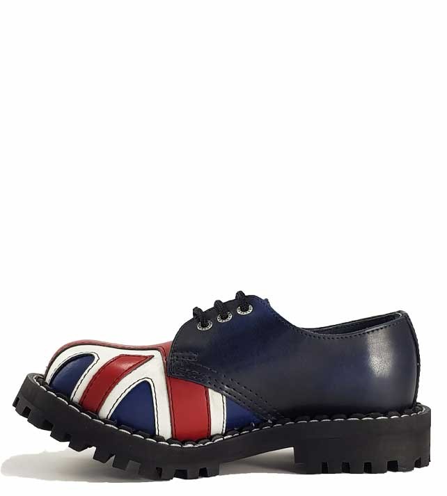 3 Dierkové Topánky Steel Britská Vlajka, kožený kožený zvršok, podrážka z tvrdenej gumy, trojité šitie, oceľová špica, flísová lepená stielka, výška topánky 10,3 cm podrážka pod pätou 3,72 cm, podrážka pod špicou 2,41 cm