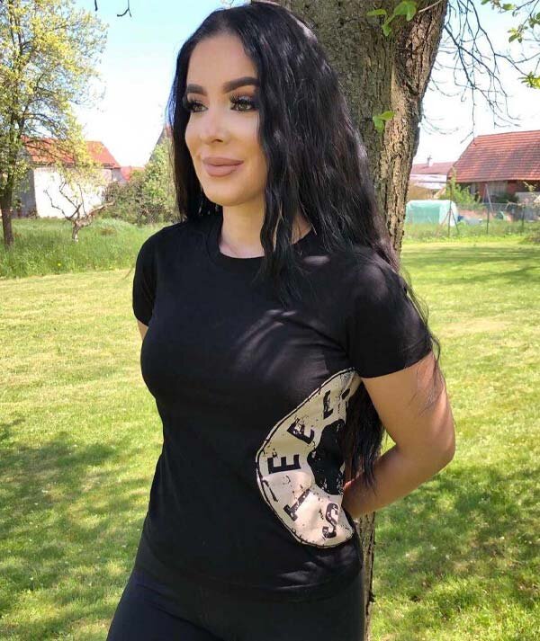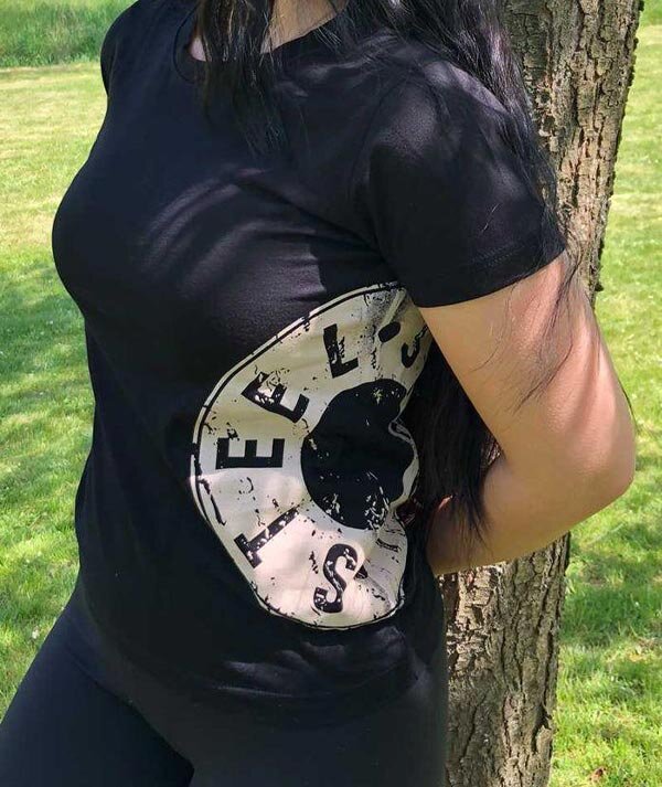 Čierné tričko, veľké tlačené logo STEEL hnedé na ľavej strane strane. Malé tlačené logo na pravom rukáve Shoes&Boots.