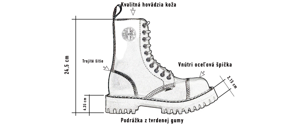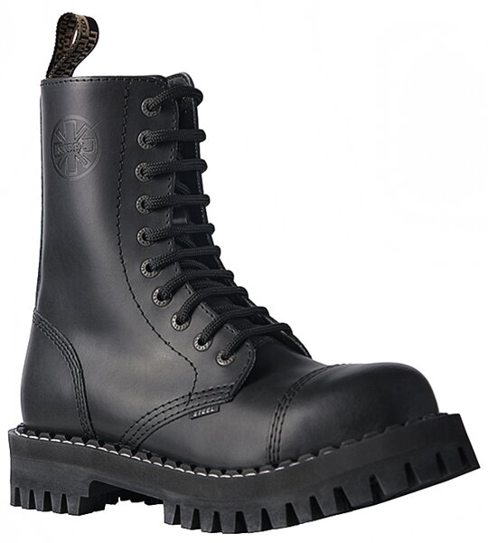 10 Dierkové Topánky Steel Čierne, kožený kožený zvršok, podrážka z tvrdenej gumy, trojité šitie, oceľová špica, flísová lepená stielka, výška topánky 24,50 cm podrážka pod pätou 4,35 cm, podrážka pod špicou 3,15 cm